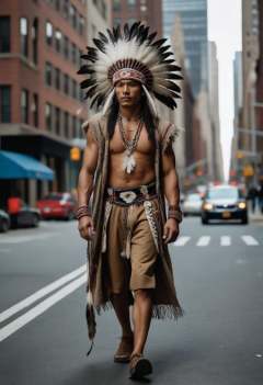 Leica Hasselblad portrait, hyperdetailed Photography, a Native American man walks proudly confidently in traditional clothing with an Indian feather hat on his head a wolf accompanies him in the streets of New York in the middle of the buildings in the middle of the road. Large view