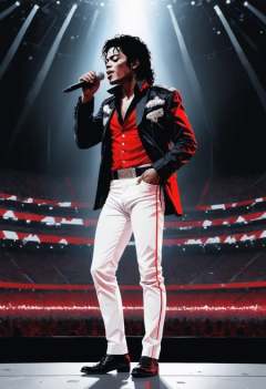 Michael Jackson singing at a standing microphone on a super-wide stage in a really big arena, by conrad roset, greg rutkowski, makoto shinkai, low poly, abstract, style of black and white drawing with red pops of color