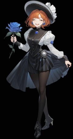 (best quality), ((masterpiece)), (highres), illustration, original, extremely detailed, <lora:GAME美学のTOP_重返未来:0.7>1girl, solo, smile, hat, flower, blue flower, holding, white background, orange hair, blue rose, closed eyes, rose, simple background, full body, high heels, holding flower, black footwear, black headwear, boots, long sleeves, open mouth, pantyhose, short hair, teeth