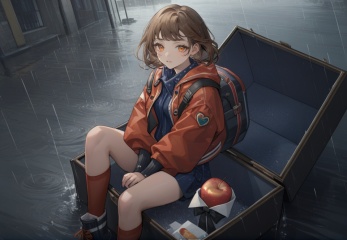 (best quality), ((masterpiece)), (highres), illustration, original, extremely detailed, <lora:GAME美学のTOP_重返未来:0.7>1girl, brown hair, fruit, solo, sitting, food, rain, looking at viewer, orange eyes, apple, jacket, socks