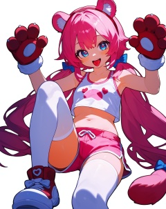 (score_9,score_8_up,score_7_up,score_6_up,score_5_up,score_4_up),solo,animal hands,thighhighs,shorts,long hair,animal ears,pink hair,twintails,white background,navel,1girl,paw gloves,simple background,gloves,tongue,white thighhighs,blue eyes,tongue out,bow,blush,short shorts,heart,looking at viewer,pink shorts,sitting,hair bow,midriff,low twintails,full body,**** top,crop top,:p,bear ears,white gloves,dolphin shorts,hairband,