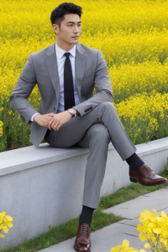 jzns,1man,male focus,asian,exquisite facial features,handsome,eye-catching,confident,grey jacket,black shirt,necktie,pants,formal sheer socks,watch,brown footwear,fashion forward,sitting,crossed legs,graceful yet melancholic posture,gracefully among canola flower,Volumetric lighting,simple background,looking at viewer,(masterpiece, realistic, best quality, highly detailed),