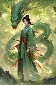1boy, black hair, chinese clothes, day,Chinese Dragon, fantasy, forest, grass, holding,Ancient Chinese Hanfu,Wood magic,Dragon horn, holding weapon, leaf, long hair, nature, outdoors, polearm, solo, standing, tree, weapon