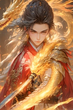 1boy, armor, braid,Chinese Dragon,Golden Magic,Chinese Silver Metal Dragon,China Golden Dragon,Ancient Chinese Hanfu, fire, jewelry, sword, weapon