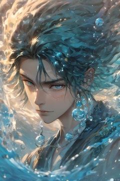 1boy, afloat, air bubble, aqua hair, blue hair, bubble, caustics, floating hair, jewelry, long hair, looking at viewer, male focus,fluid,Water magic ,Fluid hair,Flowing water, necklace, ocean, partially submerged, solo, splashing, submerged, underwater, water, water drop, waves, wet