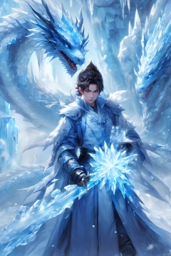 1boy, blue theme, caustics, cave, coat, holding, ice,Chinese clothing, male focus,Ice crystal,Icicles,ice,Ice Magic,Chinese Ice Dragon, solo, standing, sword, weapon