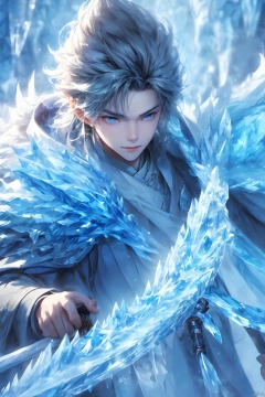 1boy, blue theme, caustics, cave, coat, holding, ice,Chinese clothing, male focus,Ice crystal,Icicles,ice,Ice Magic,Chinese Ice Dragon, solo, standing, sword, weapon
