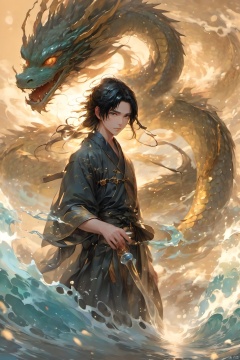 1boy, beach, black hair, bubble, caustics,Chinese Dragon, long hair, ocean,Chinese Water Dragon,Flowing water,Water magic ,fluid, ripples, splashing, standing on liquid, wading, walking on liquid, water, waves, weapon, wet