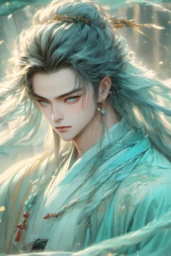 Wind Magic,Ancient Chinese men,1boy, aqua hair, blurry, blurry background, blurry foreground, closed mouth, depth of field, eyelashes, hair ornament, jewelry, lips, long hair, looking at viewer, realistic, solo, upper body, water,Ancient Chinese Hanfu,wind