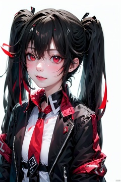 1girl,solo,long hair,looking at viewer,bangs,black hair,red eyes,long sleeves,white background,hair between eyes,twintails,closed mouth,jacket,red hair,multicolored hair,open clothes,necktie,open jacket,streaked hair,black jacket,headgear,luxiya, full_body,
