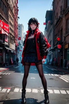 Girl, solo, Long hair, looking at the audience, skirt, Black hair, red eyes, braid, Standing, full body, Pantyhose, Red hair, Jacket, Colored hair, Black Jacket, Cyberstreetscape, Science fiction, Robot Arm, luxiya