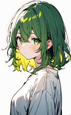 (masterpiece),(best quality),1girl, solo, green eyes, white background, simple background, looking at viewer, green hair, upper body, shirt, white shirt, blush, closed mouth, bangs, hair between eyes, looking to the side, from side
