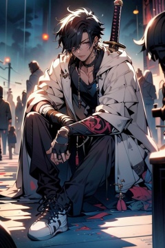 (masterpiece:1.2),best quality,highres,extremely detailed CG,perfect lighting,8k wallpaper,anime,comic,game CG,1boy, gloves, fingerless gloves, weapon, black hair, male focus, sitting, black gloves, solo, sword, shirt, black pants, pants, shoes, earrings, white footwear, closed mouth, looking at viewer, black shirt, jewelry, short hair, collared shirt, white jacket, hair between eyes, katana, sneakers, collarbone, ear piercing, sheath, jacket, full body, bangs, hair over one eye, black eyes<lora:FF_20240226194024:1>,