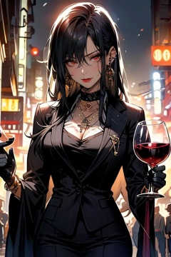 (masterpiece:1.2),best quality,highres,extremely detailed CG,perfect lighting,8k wallpaper,anime,comic,game CG,1girl, jewelry, cup, long hair, black hair, earrings, wine glass, gloves, holding, red eyes, solo, looking at viewer, drinking glass, holding cup, breasts, piercing, black gloves, necklace, cleavage, bracelet, mole, upper body, alcohol, ear piercing, wine, closed mouth, mole under eye, red lips, makeup, dress, blurry, black nails<lora:FF_20240226194024:1>,