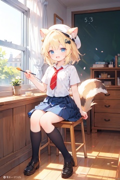 loli,petite,1girl, animal, animal_ears, artist_name, beret, black_legwear, blonde_hair, blue_eyes, blue_skirt, blush, breasts, canvas_\(object\), chair, copyright_name, cup, desk, dog, dog_tail, easel, flower, hair_ornament, hat, heart, holding, kneehighs, logo, looking_at_viewer, necktie, open_mouth, paintbrush, petals, pleated_skirt, red_headwear, school_uniform, shirt, shoes, short_hair, sitting, skirt, smile, squirrel, stool, table, tail, watch, watermark, window, wristwatch