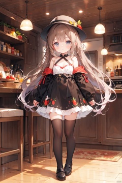 loli,petite,1girl, bangs, black_legwear, blush, breasts, brown_hair, chocolate, cleavage, cleavage_cutout, clothing_cutout, dress, earrings, food, fruit, full_body, hat, heart, kneehighs, long_hair, long_sleeves, looking_at_viewer, medium_breasts, red_eyes, shoes, sleeves_past_wrists, solo, standing, strawberry