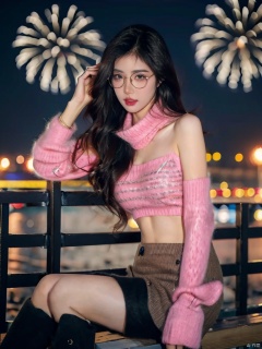 1girl,fashion model,female focus,(masterpiece, realistic, best quality, highly detailed, profession),asian,pretty,Charming eyes,exquisite facial features,bangle,sweater,scarf,skirt,black stockings,boots,sitting,night,neon,beach of city,new year,cinematic composition,,blurry,plns,sw, fireworks