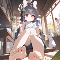 <lora:cute_xl_v3:1>,1girl,solo,toes,feet,barefoot,red eyes,soles,sitting,halo,black hair,foot focus,miyu (blue archive),foreshortening,twintails,bangs,bare legs,shorts,looking at viewer,from below,indoors,see-through,animal ears,bare arms,table,leaf on head,legs,low twintails,bare shoulders,fake animal ears,blush,rabbit ears,bra,leaf,blunt bangs,underwear,shirt,holding,white shirt,rabbit,short shorts,day,