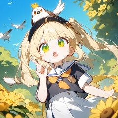 <lora:cute_xl_v3:1>,1girl,blonde hair,green eyes,hat,twintails,outdoors,solo,flower,open mouth,day,sailor collar,tree,yellow flower,on head,bird,sky,bangs,animal on head,blue sky,white sailor collar,animal,hand up,upper body,index finger raised,yellow eyes,short sleeves,long hair,white skirt,:o,two side up,