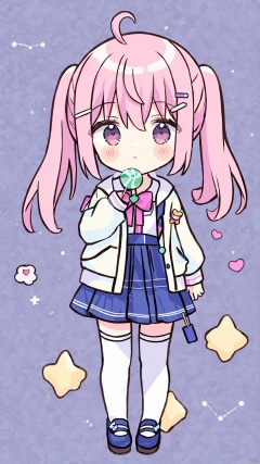 1girl, solo, long hair, looking at viewer, blush, bangs, skirt, shirt, hair ornament, red eyes, thighhighs, long sleeves, bow, holding, hair between eyes, twintails, standing, jacket, full body, pink hair, ahoge, heart, pleated skirt, parted lips, food, open clothes, shoes, hairclip, chibi, black footwear, white thighhighs, open jacket, blue skirt, plaid, blue bow, blush stickers, pink background, scrunchie, white jacket, holding food, candy, lollipop, heart ahoge, holding candy, holding lollipop, swirl lollipop, plaid background
