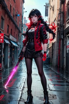 Girl, solo, long hair, looking at the audience, skirt, black hair, red eyes, braid, Standing, full body, pantyhose, red hair, Jacket, Colored hair, Black jacket, sword, Handheld weapon, Handheld, CyberStreet View, Handheld Sword, science fiction, robotic arm,uxiya, houtufeng,