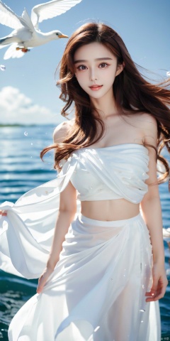 DSLR, depth of field, (1girl:1.2), , very long hair, low twintails, yellow eyes, light smile, looking at viewer, white shirt, white skirt, (flying white chiffon:1.5), bare shoulder, (flying blue petals:1.2), (standing above water surface), sky background, (cloud:1.2), white bird, floating water drops, (white border:1.2) ,