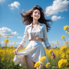 A beautiful woman is standing in a field full of rape flowers. She is wearing a white coat and a red skirt. Her skirt fluttered in the breeze like a throbbing note, in sharp contrast to the yellow rape flowers around her. Her hair was blown gently by the wind, her face was filled with a happy smile, Blue Sky White Clouds.,<lora:EMS-302987-EMS:0.600000>,<lora:EMS-260325-EMS:0.200000>,<lora:EMS-57039-EMS:0.200000>,<lora:EMS-276654-EMS:0.200000>,<lora:EMS-93-EMS:0.500000>