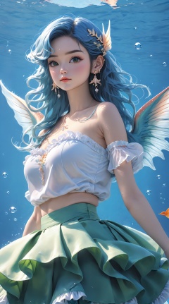 (1girl),smooth chin,masterpiece,detailed face,((hair ornament)),top quality,4k,make up,best quality,alone,single,solo,only one,one character,blush,(body blush),(detached sleeves),earrings,(blue hair),under water,(head fins),long hair,(from below),ocean,(puffy hair:1.13),head wings,frilled skirt,frilled clothes,model,looking at viewer,Cute Women,frilled shirt,bubble skirt,green skirt,full body,(detached shirt),bandeau,blue skirt,Masterpiece, the best quality,(The best hand)
