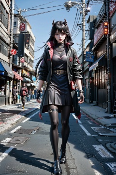 4K, CG HD quality, Girl, solo, long hair, looking at the audience, skirt, black hair, red eyes, red dreadlocks, standing, full body, pantyhose, jacket, colored hair, Black jacket, Cyberstreetscape, science fiction, red eyes, robot arm,luxiya, 1girl ,moyou, 1girl