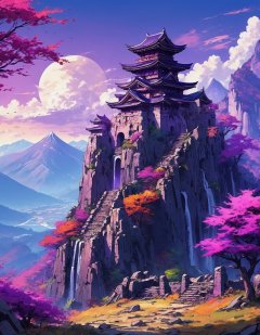 masterpiece, anime style, sharp, no humans, perfect landscape, mountains, purple trees, ruins, vibrant, colorful