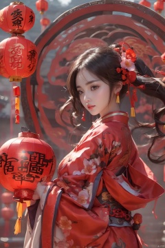 best quality,masterpiece,16k,1girl,Chinese New Year,Welcoming Spring Girl,Spring welcome clothing,Hanfu,Chinese knot,Red Theme,Close-up,Chest metal buttons,Regular circular helmet,Large chest,Complex,A large metal helmet,A huge metal helmet,ancient Chinese architecture,Red Lantern,Zhang **** Jie Cai,Full of joy and joy,Spring Festival couplets,Ancient Chinese script,Brown eyes,Clothing printing