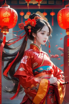 best quality,masterpiece,16k,1girl,Chinese New Year,Welcoming Spring Girl,Spring welcome clothing,Hanfu,Chinese knot,Red Theme,Water ****,(The huge circular mecha behind it:1.5),Looking up,Printed black silk,Headwear,Yellow goldfish,(full body:1.5),ancient Chinese architecture,Red Lantern,Zhang **** Jie Cai,Full of joy and joy,Spring Festival couplets,Ancient Chinese script,Brown eyes,Clothing printing