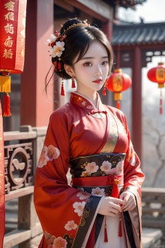 best quality,masterpiece,16k,1girl,Chinese New Year,Welcoming Spring Girl,Spring welcome clothing,Hanfu,Chinese knot,Upper body,Red Theme,Black gold earphones,White clothing,Red flower headwear,front,Gold Bell Earrings,Black gold forehead protection,Above the knee,ancient Chinese architecture,Red Lantern,Zhang **** Jie Cai,Full of joy and joy,Spring Festival couplets,Ancient Chinese script,Brown eyes,Clothing printing