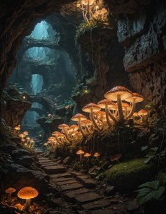 underground ancient city, glowing mushrooms, breathtaking, vibrant, magic, fantasy