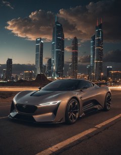 sci-fi, night, cinematic photo, futuristic design of electro car, majestic, desert city, skyscrapers, perfect lighting, clouds, vibrant, film grain