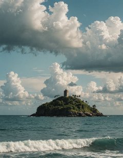 movie still, ocean, island, (clouds:0.4), epic, film grain
