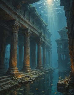 oil painting, underwater image of a ancient city, glowing, by Greg Rutkowski