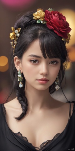 1girl,Xinjiang Girls,Hanfu,jewelry, earrings,lips, makeup, portrait, eyeshadow, realistic, nose,{{best quality}}, {{masterpiece}}, {{ultra-detailed}}, {illustration}, {detailed light}, {an extremely delicate and beautiful}, a girl, {beautiful detailed eyes}, stars in the eyes, messy floating hair, colored inner hair, Starry sky adorns hair, depth of field, large breasts,cleavage,blurry, no humans, traditional media, gem, crystal, still life, Dance,movements, All the Colours of the Rainbow,zj,