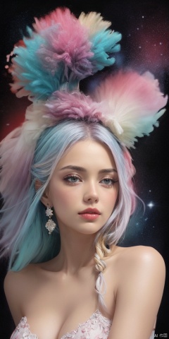 1girl,Naxi girls, Naxi costumes,Pink and white themes,large breasts,jewelry, earrings,lips, makeup, portrait, eyeshadow, realistic, nose,{{best quality}}, {{masterpiece}}, {{ultra-detailed}}, {illustration}, {detailed light}, {an extremely delicate and beautiful}, a girl, {beautiful detailed eyes}, stars in the eyes, messy floating hair, colored inner hair, Starry sky adorns hair, depth of field, large breasts,cleavage,blurry, no humans, traditional media, gem, crystal, still life, Dance,movements, All the Colours of the Rainbow,zj,