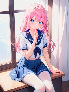 finely detail,Depth of field,(((masterpiece))),((extremely detailed CG unity 8k wallpaper)),best quality,high resolution illustration,Amazing,highres,intricate detail,best illumination,best shadow,1girl,solo,white pantyhose,curtains,curtain grab,long hair,pink hair,school uniform,skirt,window,serafuku,looking at viewer,smile,blue eyes,pleated skirt,blush,sitting,short sleeves,white shirt,shirt,indoors,sailor collar,socks,blue skirt,midriff peek,bangs,kneehighs,index finger raised,black socks,finger to mouth,