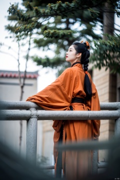 1girl, solo, long hair, black hair, hair ornament, ponytail, outdoors, japanese clothes, looking back, kimono, hair bun, from behind, blurry, lips, sash, profile, makeup, depth of field, blurry background, looking up, lipstick, realistic, railing, red lips, orange kimono, hanfu, hanfu zhanguo