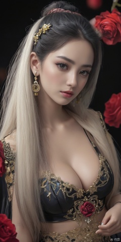 1girl,Han Chinese girls,yellow Hanfu,chinese clothes,large breasts,Black Rose,jewelry, earrings,lips, makeup, portrait, eyeshadow, realistic, nose,{{best quality}}, {{masterpiece}}, {{ultra-detailed}}, {illustration}, {detailed light}, {an extremely delicate and beautiful}, a girl, {beautiful detailed eyes}, stars in the eyes, messy floating hair, colored inner hair, Starry sky adorns hair, depth of field, large breasts,cleavage,blurry, no humans, traditional media, gem, crystal, still life, Dance,movements, All the Colours of the Rainbow,zj,