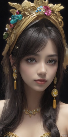 1girl,Han Chinese girls,yellow Hanfu,chinese clothes,large breasts,Black Rose,jewelry, earrings,lips, makeup, portrait, eyeshadow, realistic, nose,{{best quality}}, {{masterpiece}}, {{ultra-detailed}}, {illustration}, {detailed light}, {an extremely delicate and beautiful}, a girl, {beautiful detailed eyes}, stars in the eyes, messy floating hair, colored inner hair, Starry sky adorns hair, depth of field, large breasts,cleavage,blurry, no humans, traditional media, gem, crystal, still life, Dance,movements, All the Colours of the Rainbow,zj,