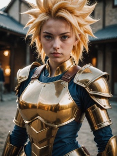 Photo of a girl,cinematic film still,super saiyan, full plate armor, ony fe 12-24mm f/2.8 gm, close up, 32k uhd, light navy and light amber, amazing quality, wallpaper, analog film grain