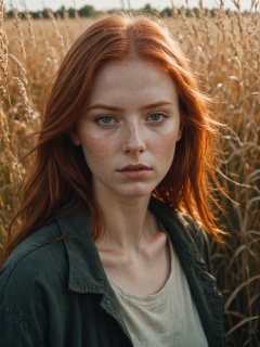 cinematic film still, close up, photo of redheaded girl near grasses, fictional landscapes, (intense sunlight:1.4), realist detail, brooding mood, ue5, detailed character expressions, light amber and red, amazing quality, wallpaper, analog film grain