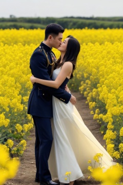 👫,a Handsome man and a sexy woman hugging together,imminent kiss,,standing gracefully among canola flower, a high-definition photo, Asian,exquisite facial features,(muscular man, wearing military_uniform), (slim woman, wearing evening_gown,black pantyhose), face to face, affectionate, charming eyes, outdoors, soft lighting,(masterpiece, realistic, Realism, best quality, highly detailed, 8K Ultra HD, sharp focus, profession),plns, jzns