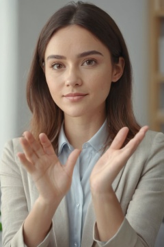 1girl,(open hand:1.2),neutral background with soft lighting,subtle office setting,daytime,(looking directly at the camera:1.2),close-up shot,approachable and confident,nice hands,perfect hands,8k,Best quality,realistic style.,<lora:HandFineTuning_XL:0.6>,