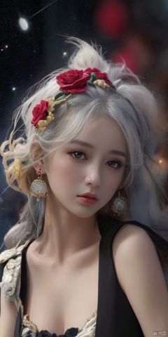 1girl,Han Chinese girls,yellow Hanfu,chinese clothes,large breasts,Black Rose,jewelry, earrings,lips, makeup, portrait, eyeshadow, realistic, nose,{{best quality}}, {{masterpiece}}, {{ultra-detailed}}, {illustration}, {detailed light}, {an extremely delicate and beautiful}, a girl, {beautiful detailed eyes}, stars in the eyes, messy floating hair, colored inner hair, Starry sky adorns hair, depth of field, large breasts,cleavage,blurry, no humans, traditional media, gem, crystal, still life, Dance,movements, All the Colours of the Rainbow,zj,