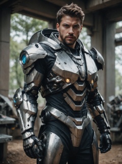 (masterpiece, best quality, ultra-detailed, best shadow), cinematic film still, photo of a man wearing a high tech scifi armor, mecha armor, male focus, armor, solo, facial hair, cape, beard, looking at viewer, blue eyes, blurry background, power armor, knee protection, standing, brown hair, science fiction  <lora:aesthetic_anime_v1s:1.2>