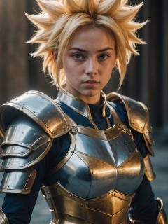 Photo of a girl,cinematic film still,super saiyan, full plate armor, ony fe 12-24mm f/2.8 gm, close up, 32k uhd, light navy and light amber, amazing quality, wallpaper, analog film grain